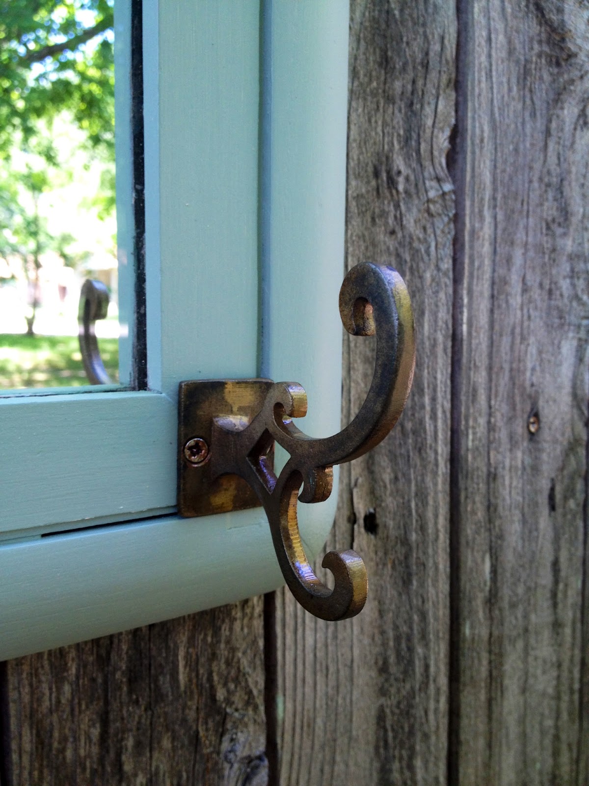 This stunning wall hanging was made from an old iron porch column, and obviously old shutters. She painted, glazed, and dry brushed each one to give them all a very deep rustic feel. |